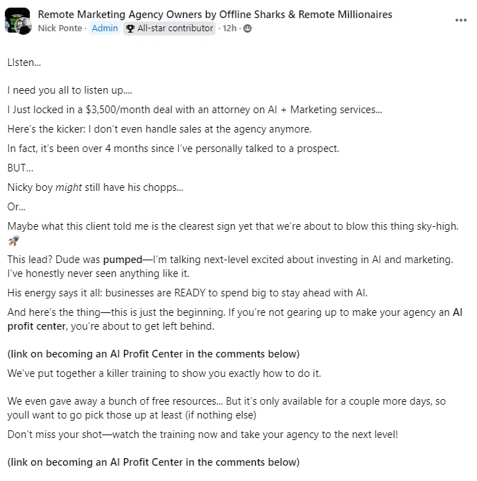 Stop overthinking and start selling. In this session, you’ll learn how to build a simple but powerful AI agency framework in under 20 minutes. We’ll strip away the noise and show you the only elements you actually need to launch — no tech overwhelm, no wasted hours. By the end of Part 1, you’ll have a clear, actionable business model and be ready to start offering your services immediately.